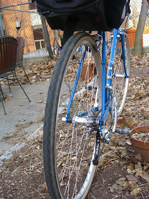 I sold a bike a today. The converted Motobecane Grand Record fixed-gear is gone by way of Craigslist. I think it found a good and appreciative home. That matters because it's a good bike and someone should ride and enjoy it. It was a 1980's lugged frame of Vitus tubing and a Reynolds 531 fork. There was some chrome detail too. A long while ago, I carefully cleaned it up, re-greased everything, added a few new bits and found it to be a fine fixed-gear, as quick and comfortable as could be. I did my first 100 miler on it. At any rate, a recent purchase motivated me to consider thinning the herd. My bikes numbered four; some say that's a lot, some say that's too few, but three feels about right to me. The appropriate number of bikes to own is a complex issue for another time. Anyway I decided to get rid of a bike that doesn't completely suit me anymore. The Motobecane was a terrific ride, but it was flawed in a way that I could not accept. It was French - meaning having odd French-sized parts. Replacement parts are almost impossible to find. The best shops couldn't even determine what the bolt spacing was on the chainrings, much less find a replacement ring. Keeping this one rolling was more about nursing old parts along rather than replacing worn out rings and things with more durable newer parts. This is something that can be done with considerable time and effort. Though my bikes get too much wear and tear to make that trade-off sustainable. So it goes, maybe I'll have to find another oldie but goodie to bring back to life.